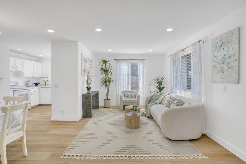 Rare townhouse-style condo in the desirable Crescendo community, ideally positioned on a quiet interior corner with open views and abundant natural light. This upper-level 1-bedroom, 1-bath home offers uncommon privacy with no neighbors above or below, plus an attached garage with a dedicated storage room and built-in shelving. The community also offers ample additional and guest parking throughout, a rare and convenient feature for the area. The open living and dining area connects seamlessly to an oversized private patio through dramatic floor-to-ceiling glass doors, creating an exceptional indoor-outdoor space rarely found in a condo. Open, airy, and well-separated from neighboring buildings, the setting feels bright and inviting. Recent updates include new flooring, fresh interior paint, white quartz countertops, light gold fixtures, modern lighting, and in-unit washer and dryer. Residents enjoy resort-style amenities including a pool, spa, and beautifully landscaped grounds. Prime North San Jose location near major employers including Nvidia and Cisco, as well as Rivermark, Levis Stadium, Light Rail, and convenient freeway access.