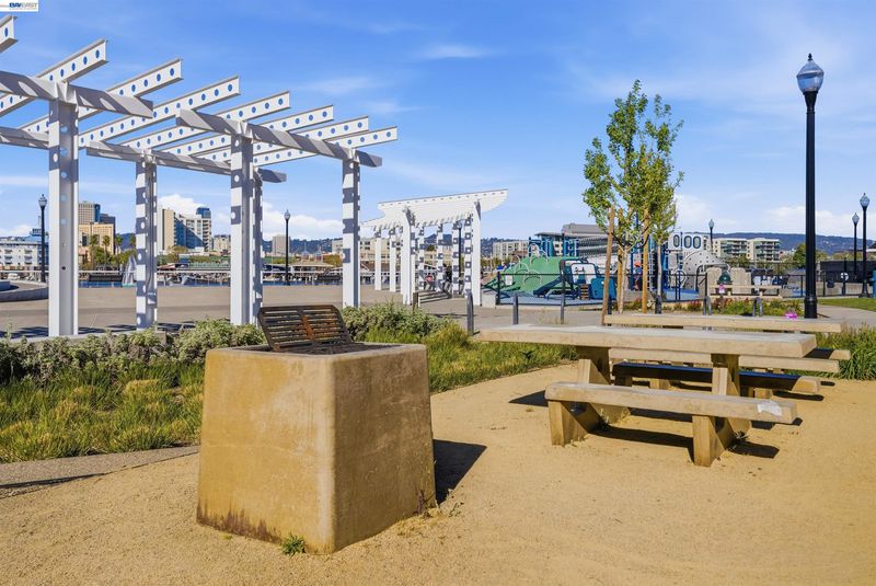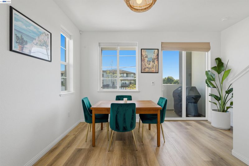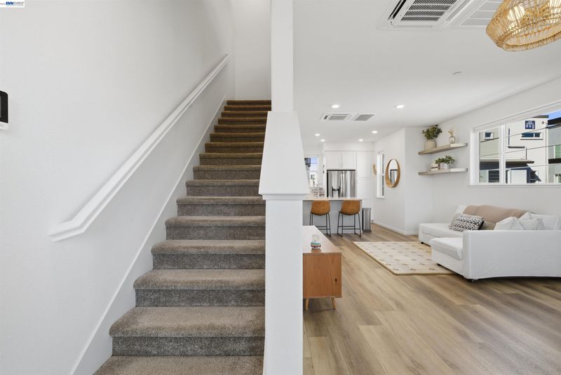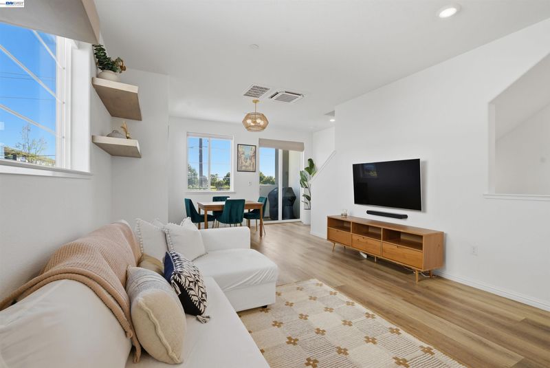 Experience the best of Alameda in this light-filled 2-bedroom, 1.5-bath townhouse-style condo in the desirable Bay37 waterfront community. Built in 2022 and beautifully maintained, this bright end unit offers windows on three sides with both sunrise and sunset exposures. The thoughtfully designed interior features a chef's kitchen with quartz countertops, a marble backsplash, an open living and dining area perfect for entertaining, and a private balcony great for unwinding with the sunset views. Upstairs, two sunlit bedrooms enjoy natural light and generous storage with custom closet systems, a spacious full bath, plus a second private balcony. Smart living is built in throughout: central A/C with three zoned digital thermostats, smart appliances, and premium window coverings. Both balconies and the front entrance open to a serene greenway, providing peaceful views and a sense of tranquility. The home is ideally located near Alameda Landing, with easy walking or biking access to retail. The location is truly exceptional—Bay37 is just steps from the Alameda waterfront with scenic walking trail, picnic areas, and a playground, with convenient access to transportation, including ferry to Jack London Square and SF. Enjoy waterfront serenity while staying connected to city life.