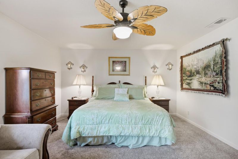 Hugely Desirable, much sought after, single level, end unit on lake, inside award winning Villages Golf & Country Club, by the beautiful Evergreen foothills. Upgraded kitchen, cherry stained cabinets, Alexandria Granite countertop & tastefully re-designed access to dining room. 5 custom, hand painted doors with story-telling scenes, leading to bedrooms, bathrooms & laundry rm. Stunning, enclosed patio with newer windows and sliding patio doors for fab indoor/outdoor feel. This glorious addition with coffee table & sofas one end & formal dining table the other, makes for a soothing daytime setting & a magnificent evening entertainment area. 3rd bedroom fitted with Wet Bar allows for great versatility, bedroom/office or fun cocktail area. Spacious living room features high ceiling & separate dining room has beautiful duel aspect windows. Primary bedroom has separate vanity area & walk-in closet, both bedrooms have full length, glass sliding doors leading to patio. HOA fees includes golf membership, Water, Sewer, Cable TV, Garbage, 18 & 9 hole golf course, 4 Swimming Pools, 6 Tennis Courts, Bocce & Pickleball Courts, Gym, Restaurant, Bistro, Library & US Post office, One resident must be 55. Similar property sold in August for $1,132,500, only 7 days on market. Don't miss this one!