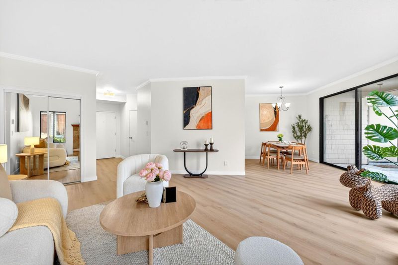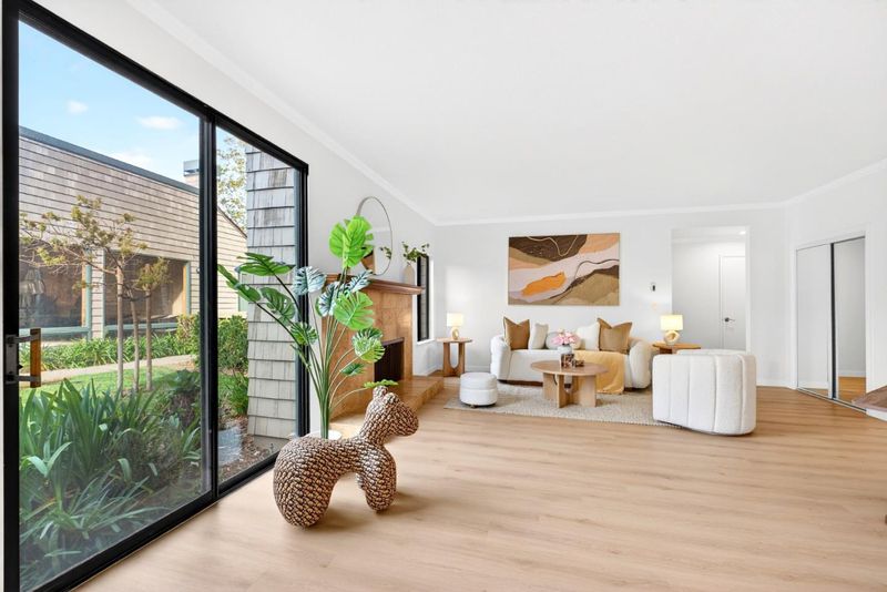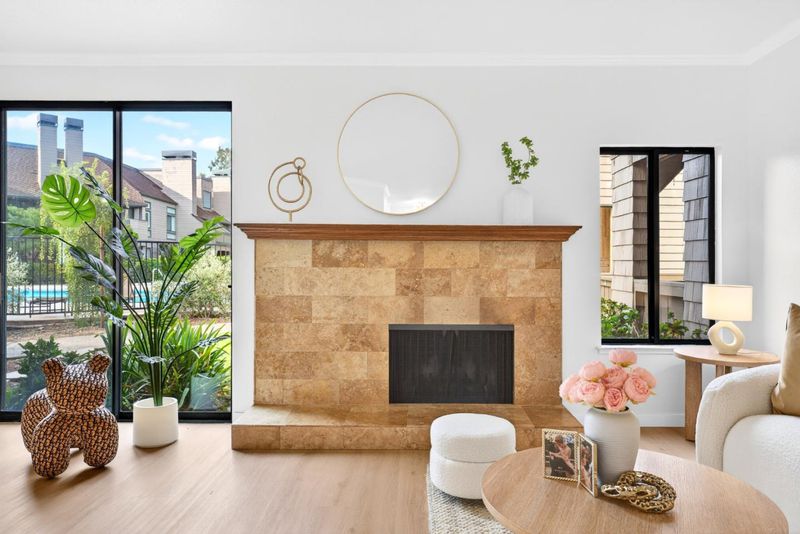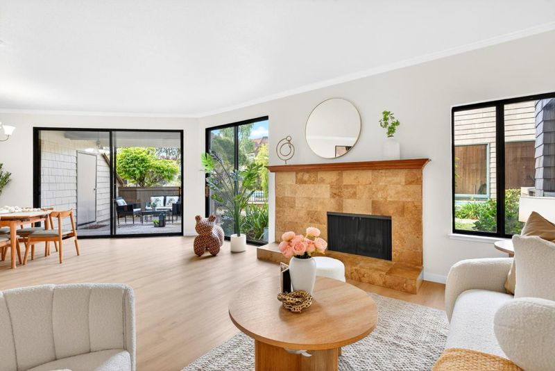 Experience the ultimate Peninsula lifestyle in this sophisticated 2-bedroom, 2-bathroom Redwood Shores retreat. Spanning 1,240 sq. ft., this light-filled home features an open-concept layout with stylish wide-plank flooring and designer track lighting. The gourmet kitchen shines with warm wood cabinetry, granite countertops, and premium stainless steel appliances. Relax by the elegant tiled fireplace or step through sliding glass doors to multiple private patios, perfect for alfresco dining amidst lush greenery. The primary suite is a true sanctuary, offering private balcony access and a high-end custom walk-in closet with integrated storage. Both bathrooms are tastefully updated, featuring granite vanities and designer tiling. Beyond the front door, the community feels like a resort, centered around a tranquil fountain courtyard and manicured gardens. Residents enjoy premier amenities including a sparkling pool, soothing spa, and direct access to the scenic Redwood Shores lagoon. With a community dock, waterfront seating, and convenient kayak storage just steps away, outdoor adventure is always at your doorstep. This meticulously maintained home offers a perfect blend of modern comfort and coastal charm.