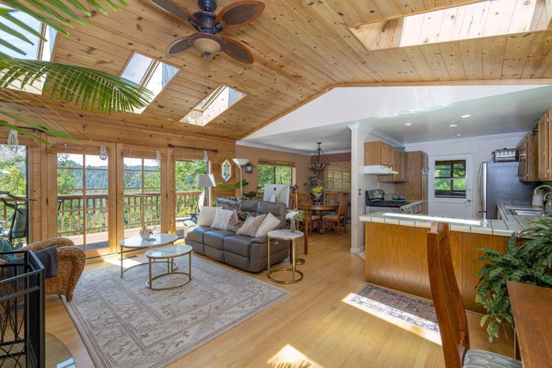 This ridge-top home offers spectacular views and southern exposure, bathing the home in ample sunlight. The open floor plan creates a peaceful ambiance with a seamless flow into the dining room, living room, and family room, each uniquely designed for comfort and style. The kitchen is a standout, offering a functional and inviting space for every culinary adventure. The large bedrooms soak in afternoon sunlight, with forest and mountain views from the many large windows. In addition to the spacious main living areas, the home boasts a bonus room, workshop, artist studio, and home gym. The expansive barn storage is ideal for all your organizational needs. Step outside to discover the magical gardens, a serene retreat where you can relax and enjoy the best views Boulder Creek has to offer. This property truly combines beauty and functionality in a setting that feels like a private oasis. Located just minutes from Boulder Creek, a quick drive to Saratoga, and a short walk to Garrahan Park and nearby hiking trails, this home provides everything you need to enjoy mountain life and more!