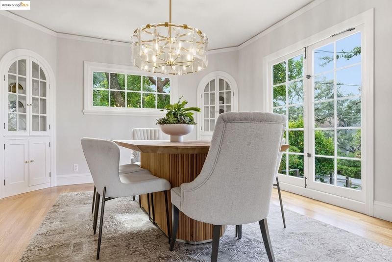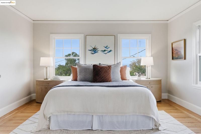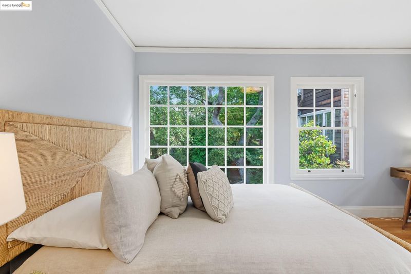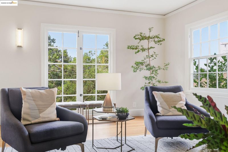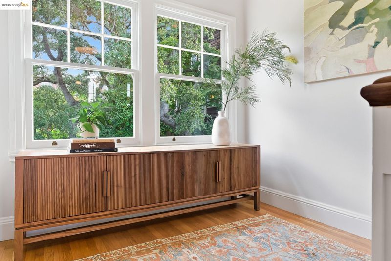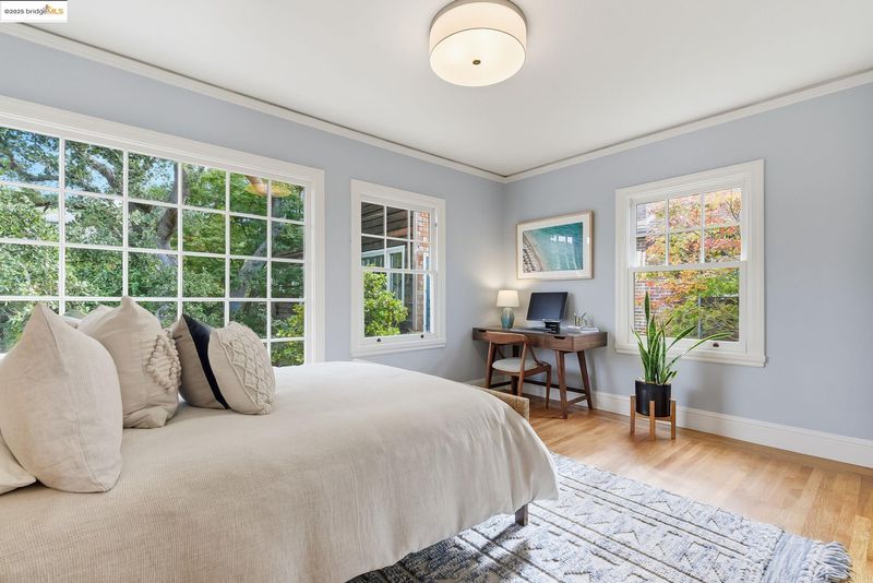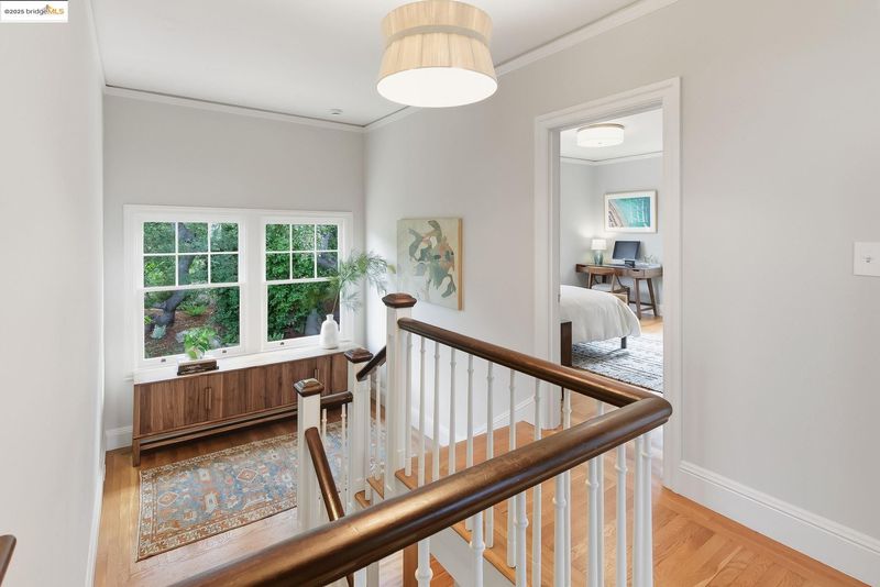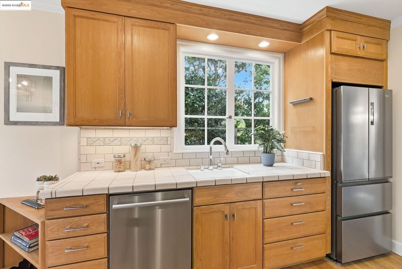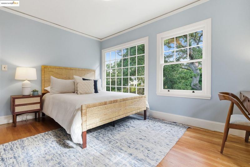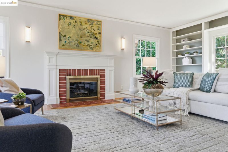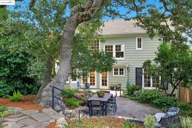 This striking 1920s classic is set in a lovely garden graced by some of the venerable oaks that gave the neighborhood its name. The spacious entry hall and central stairs rise to a landing that has a wall of windows overlooking the garden. The large bright living room boasts windows on three sides, a fireplace, and the character and style of handsome built-ins. Across the hall, in the dining room, original corner cabinets continue the appealing handcrafted details. The kitchen includes a central island, a breakfast nook, and level out access to the inviting garden. Upstairs, there is a spacious primary bedroom with fireplace and views of the Bay. Two additional bedrooms and an updated bathroom with floor to ceiling tiles complete the second floor. Entering the back garden feels like stepping into a soothing natural forest glade. And all of this is just minutes away from AC Transit, BART, Solano Avenue, and the Kensington Sunday farmers’ market.